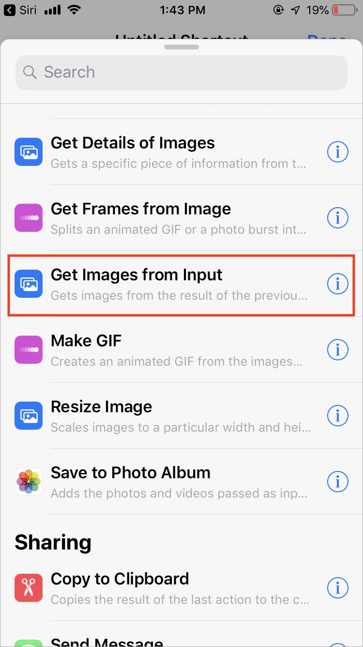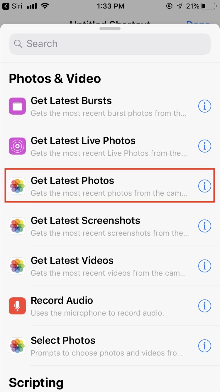 - Вы увидите много действий, которые вы можете комбинировать для автоматизации задач. Здесь, чтобы создать ярлык для создания GIF-файлов, мы добавим действие «Получить последние фотографии» под фото. Категория видео.