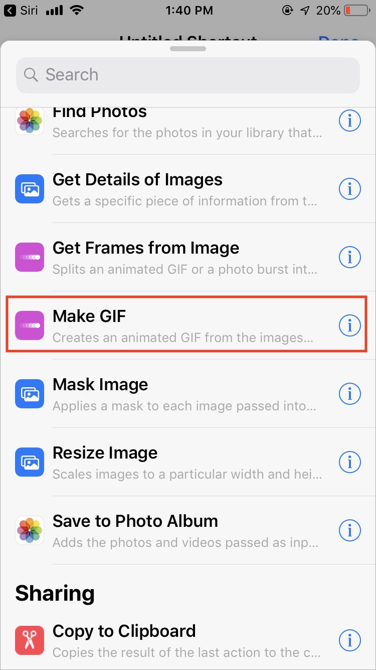 - Следующее действие, которое вам нужно добавить, это «Сделать GIF», который создает анимированный GIF из изображений, переданных в действие.