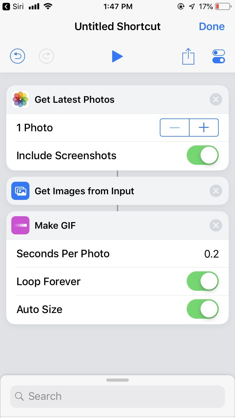 Помимо использования шаблонов, вы также можете создавать свои собственные ярлыки для некоторых задач. Создание ярлыка было бы легче для вас, если бы вы имели некоторые предварительные знания о понятиях логики и программирования. Ниже мы создали ярлык, который активируется путем произнесения фразы в Siri и создает GIF из последних 4 фотографий из вашей галереи.