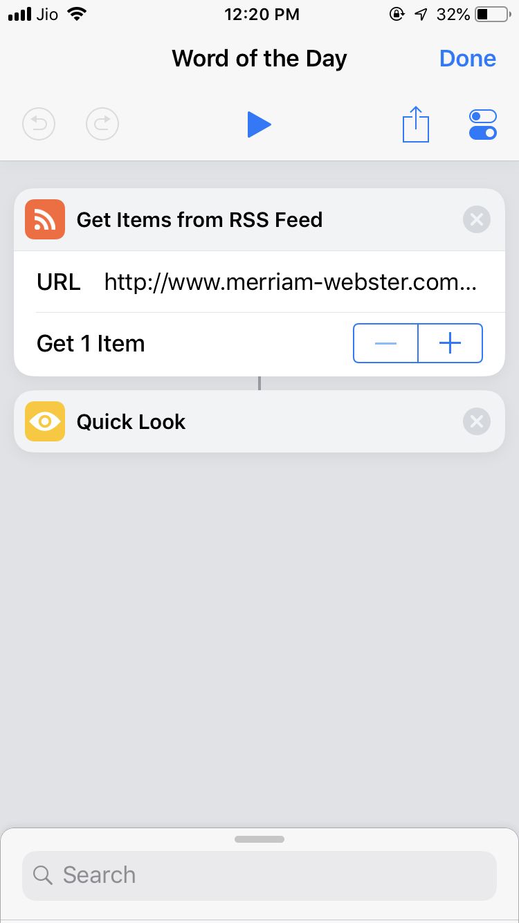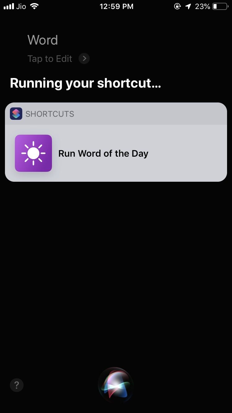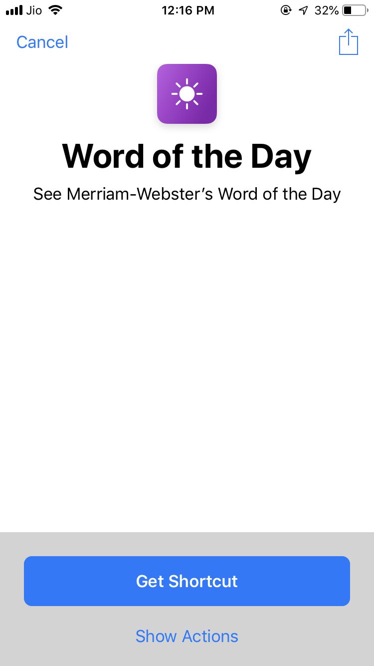 Вы можете настроить эти ярлыки, предоставляя свои собственные входные данные и обмениваясь ими. Для демонстрации я выбрал ярлык «Слово дня» в категории «Узнай что-то новое!». Этот ярлык показывает вам новое слово из словаря Merriam-Webster, а также его значение каждый день, чтобы расширить свой словарный запас.