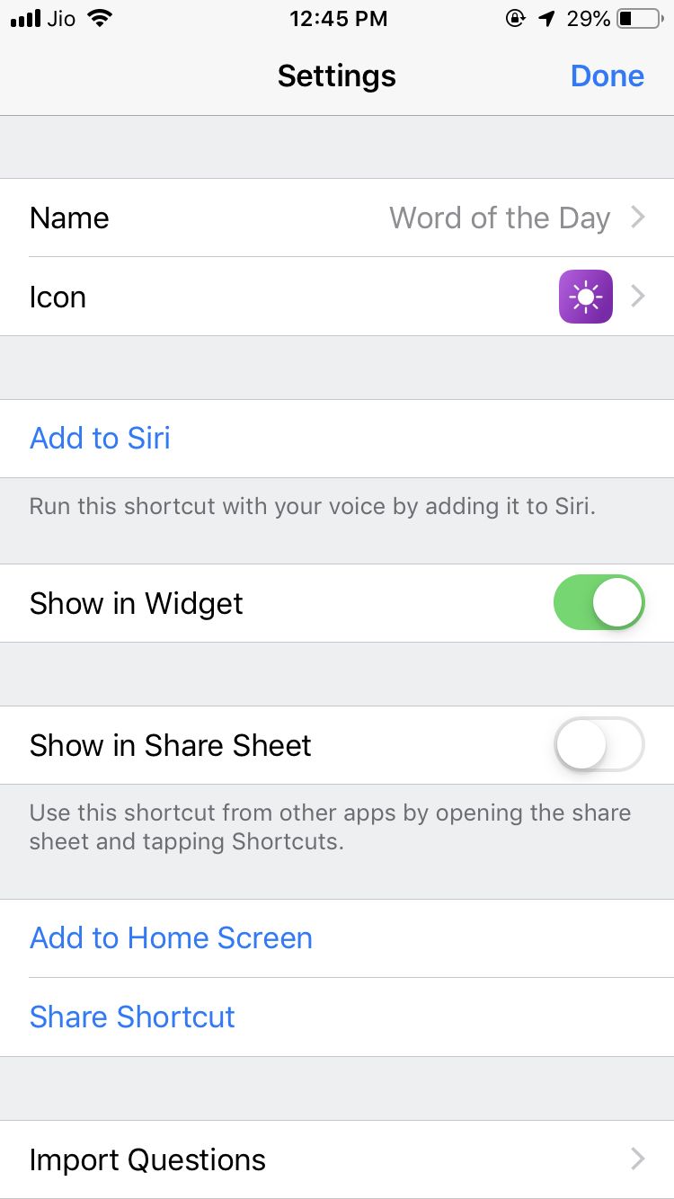 - Далее нажмите кнопку «Переключить» в верхнем правом углу экрана, чтобы переименовать ярлык и добавить для него фразу Siri. Кроме того, вы можете добавить ярлык на домашний экран / виджеты.