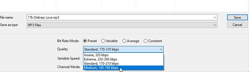 Опять же, это всего лишь эксперимент. Сделайте один для «Standard» и один для «Medium», затем посмотрите, какой из них звучит лучше. Я сделал «Medium», услышал небольшое снижение качества, но ничего, что меня не беспокоило. В процессе я получил файл с 6,8 МБ до 3,5 МБ.